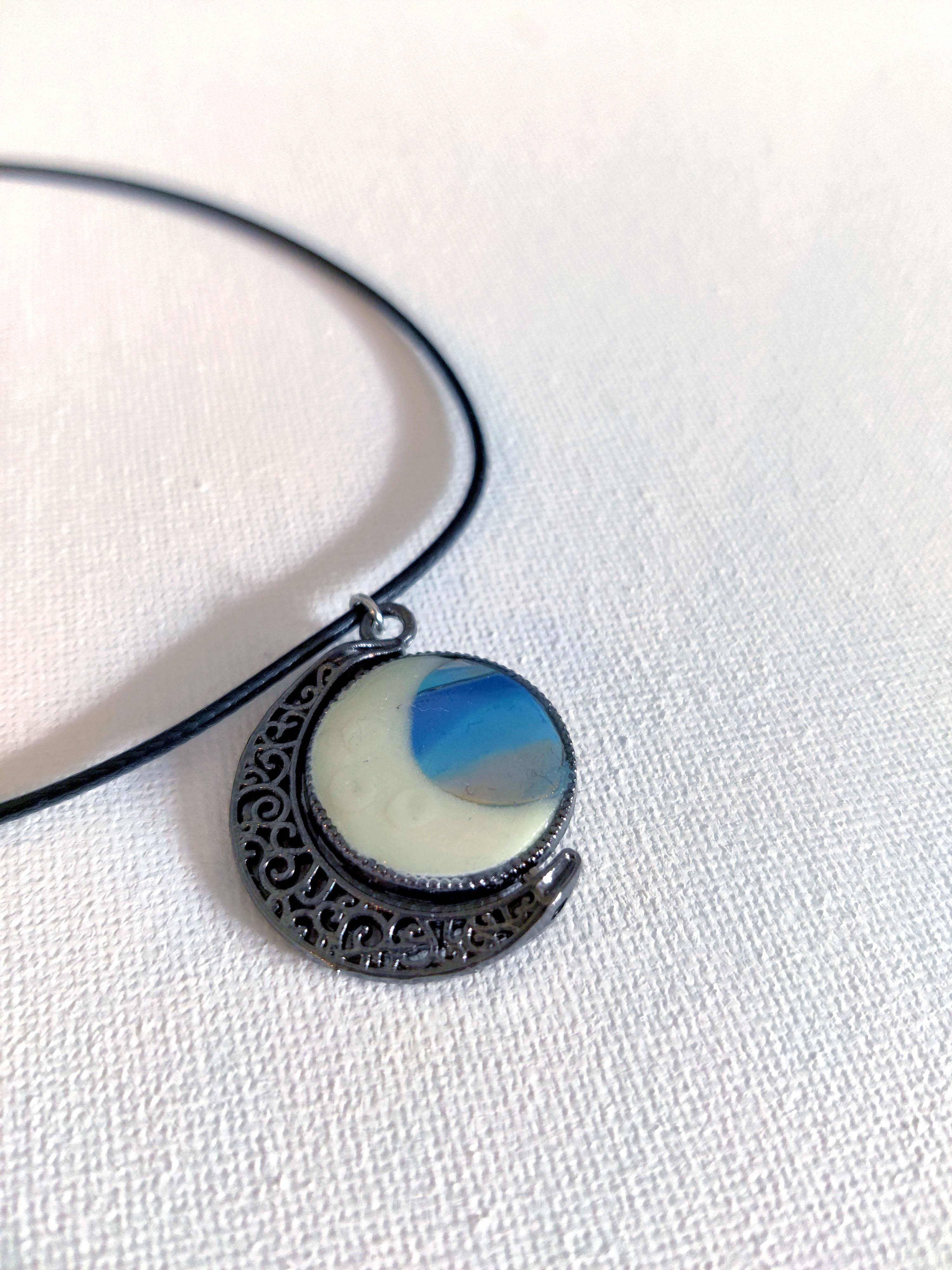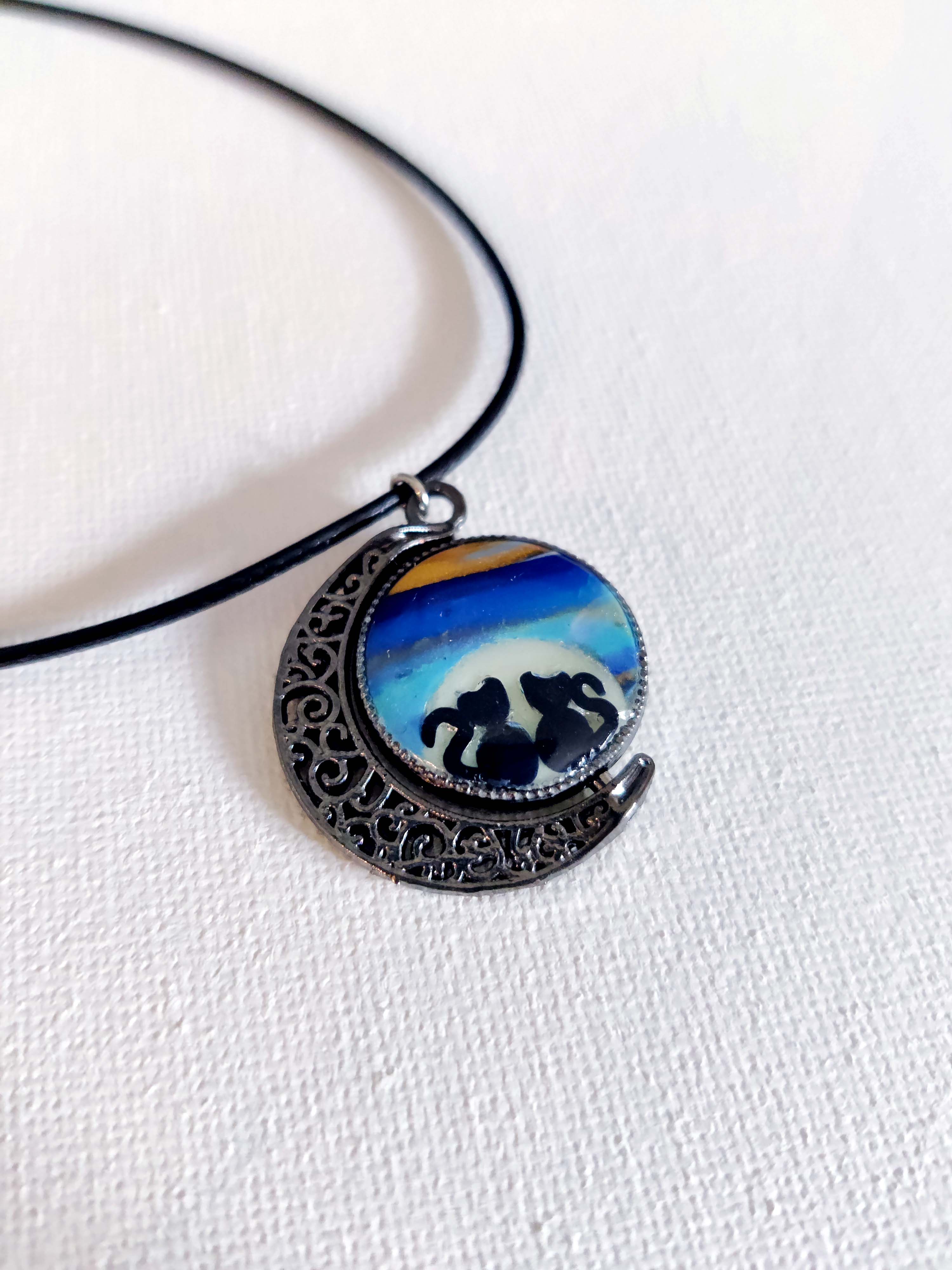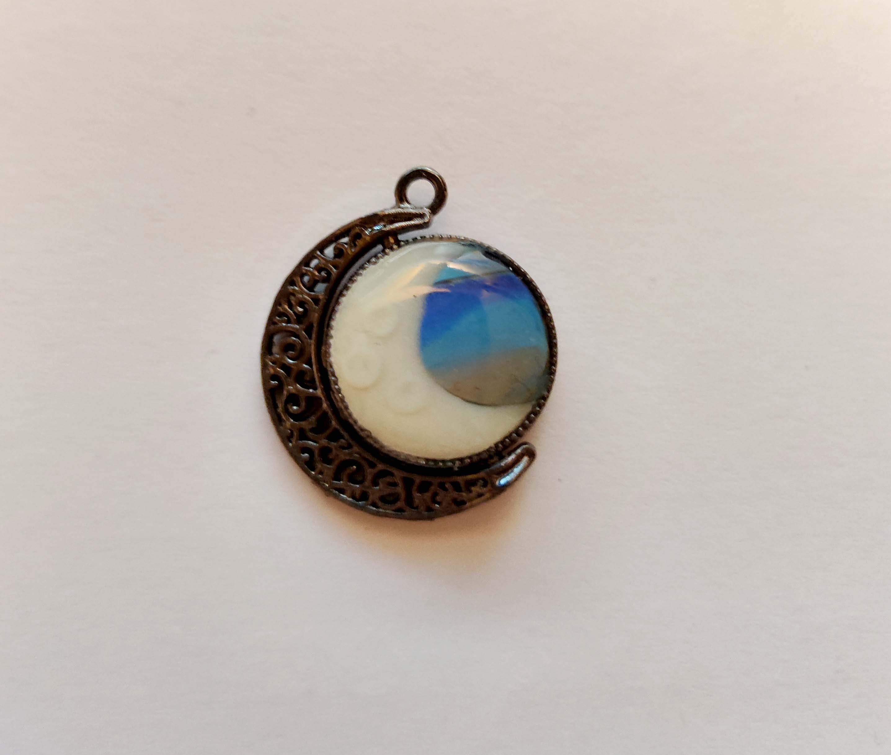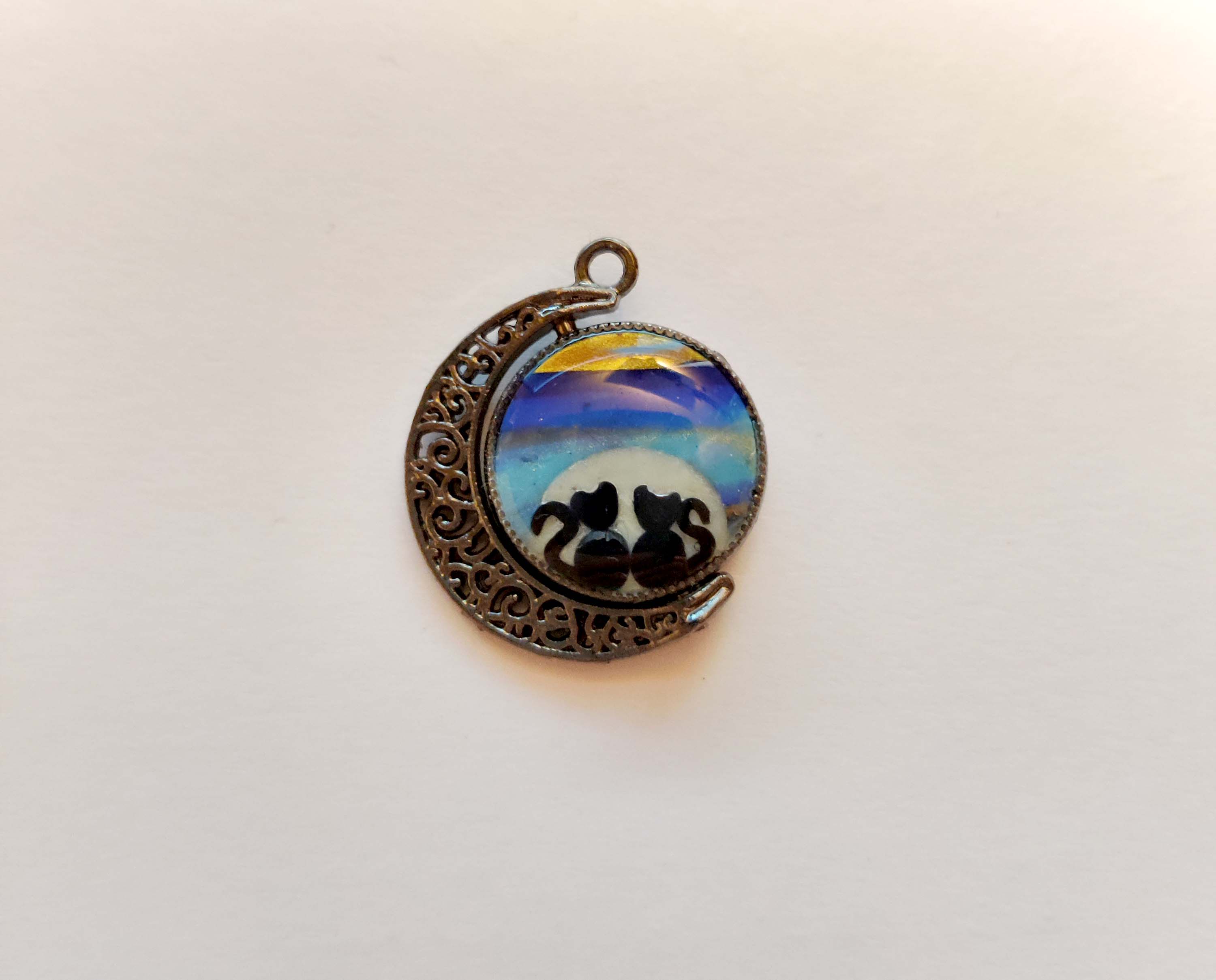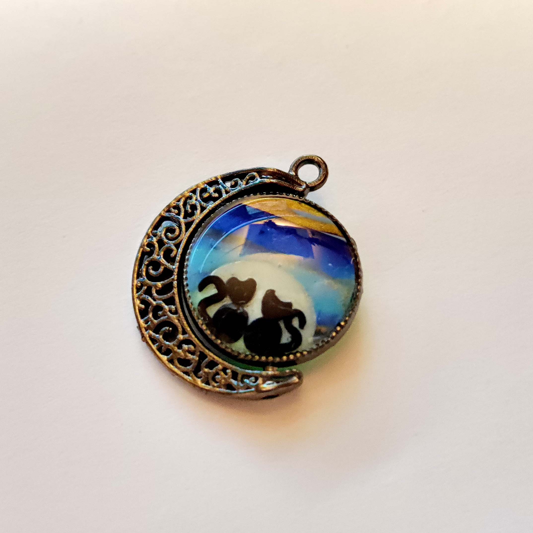 The pendant is double sided and the center spins while the crescent moon stays in place. The scene is made using polymer clay, and sealed with resin for a long lasting piece. It measures approximately 1x1 inches.