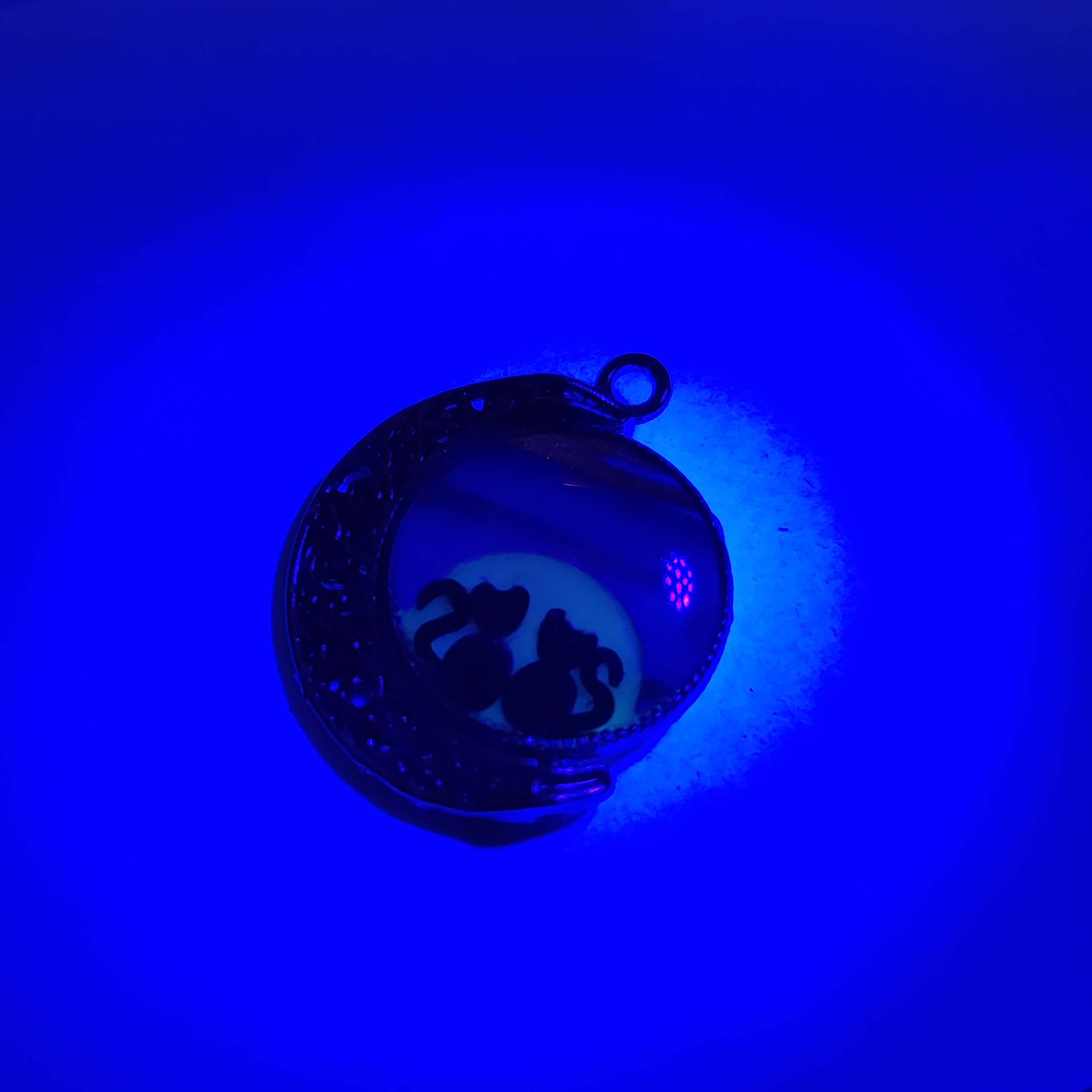 A dual sided pendant featuring two black cats viewing the night sky. The pendant swivels, and the moon on each side glows in the dark and is UV reactive.