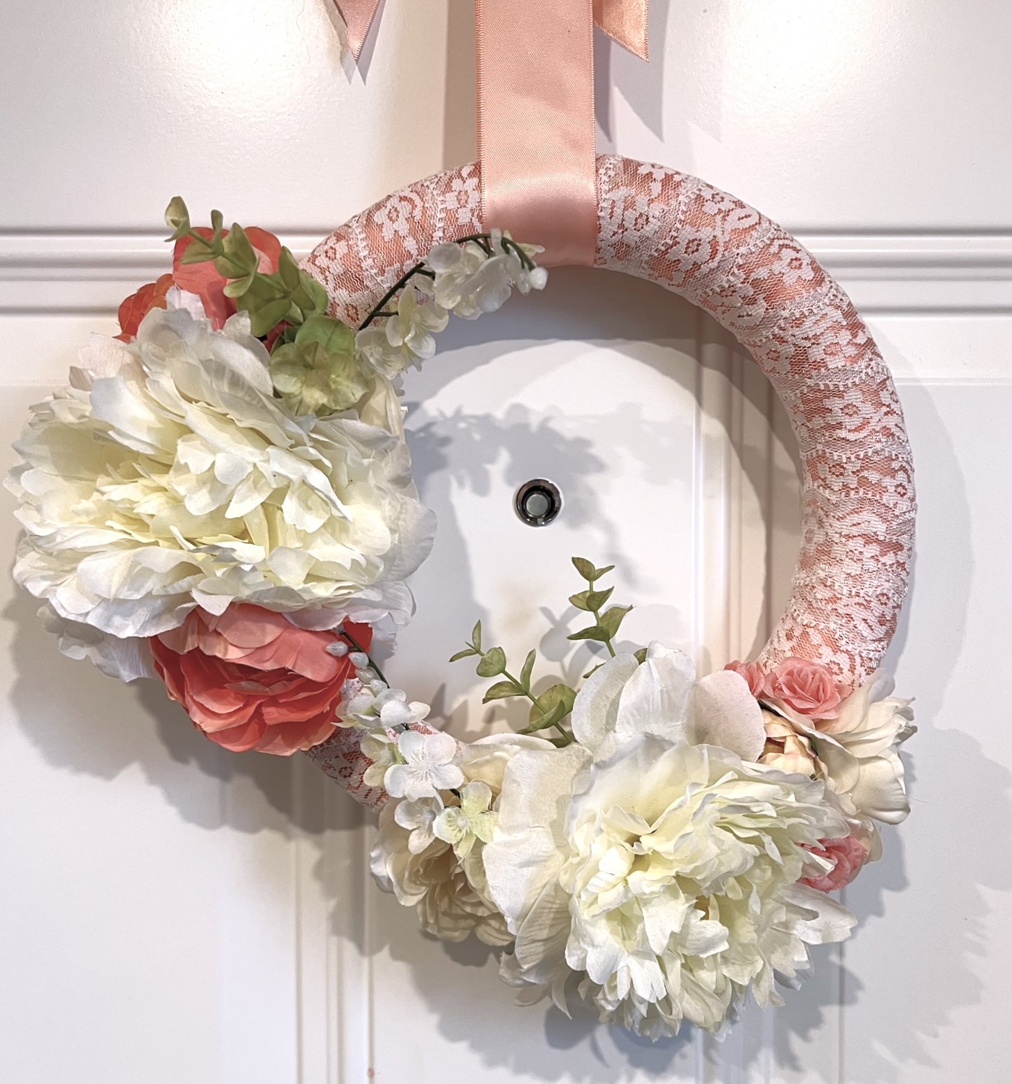 Wrapped in satin and lace, with faux flowers and plants placed asymmetrically. This wreath is on a 10 inch foam base, while the flowers extend 2-3 inches outward where they are placed. It is not weatherproof, and is best kept on a covered porch or displayed inside the home.