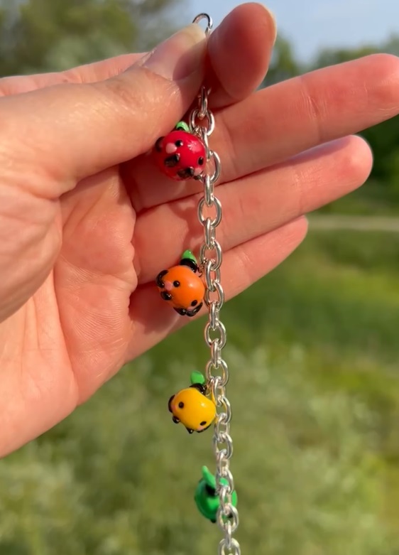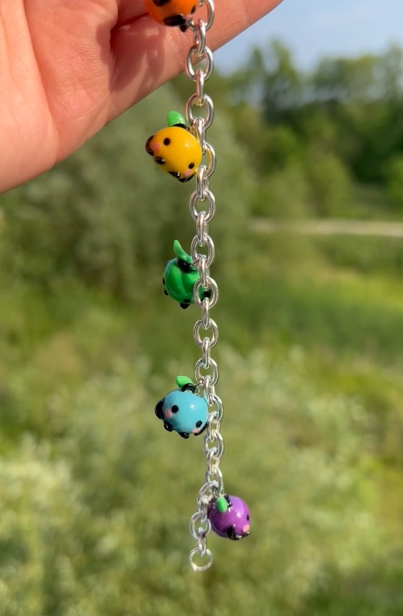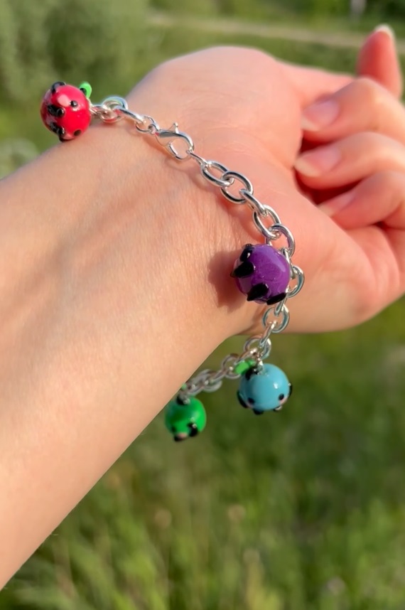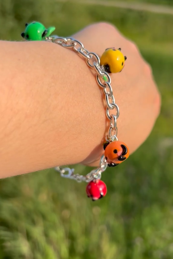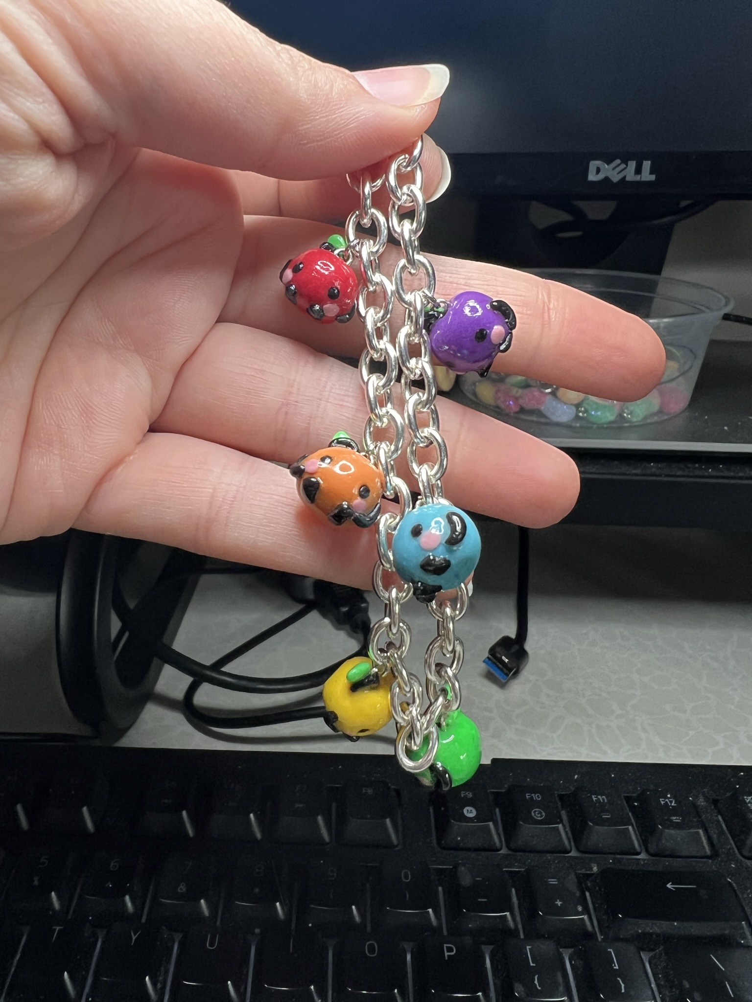 This charm bracelet features 6 handmade Junimo charms, in the colors of the rainbow! It has a simple lobster clasp, and will fit a 6 inch sized wrist.