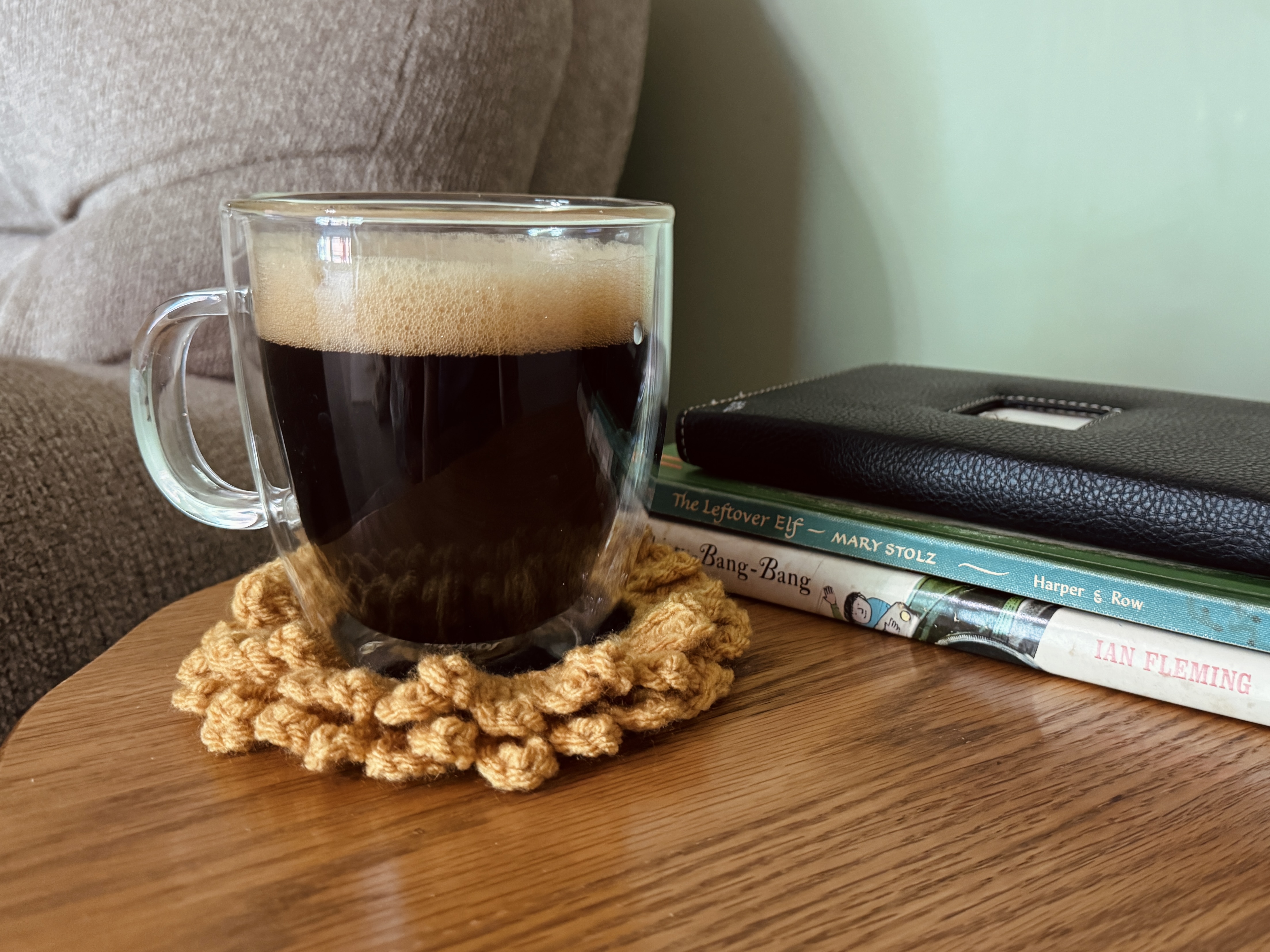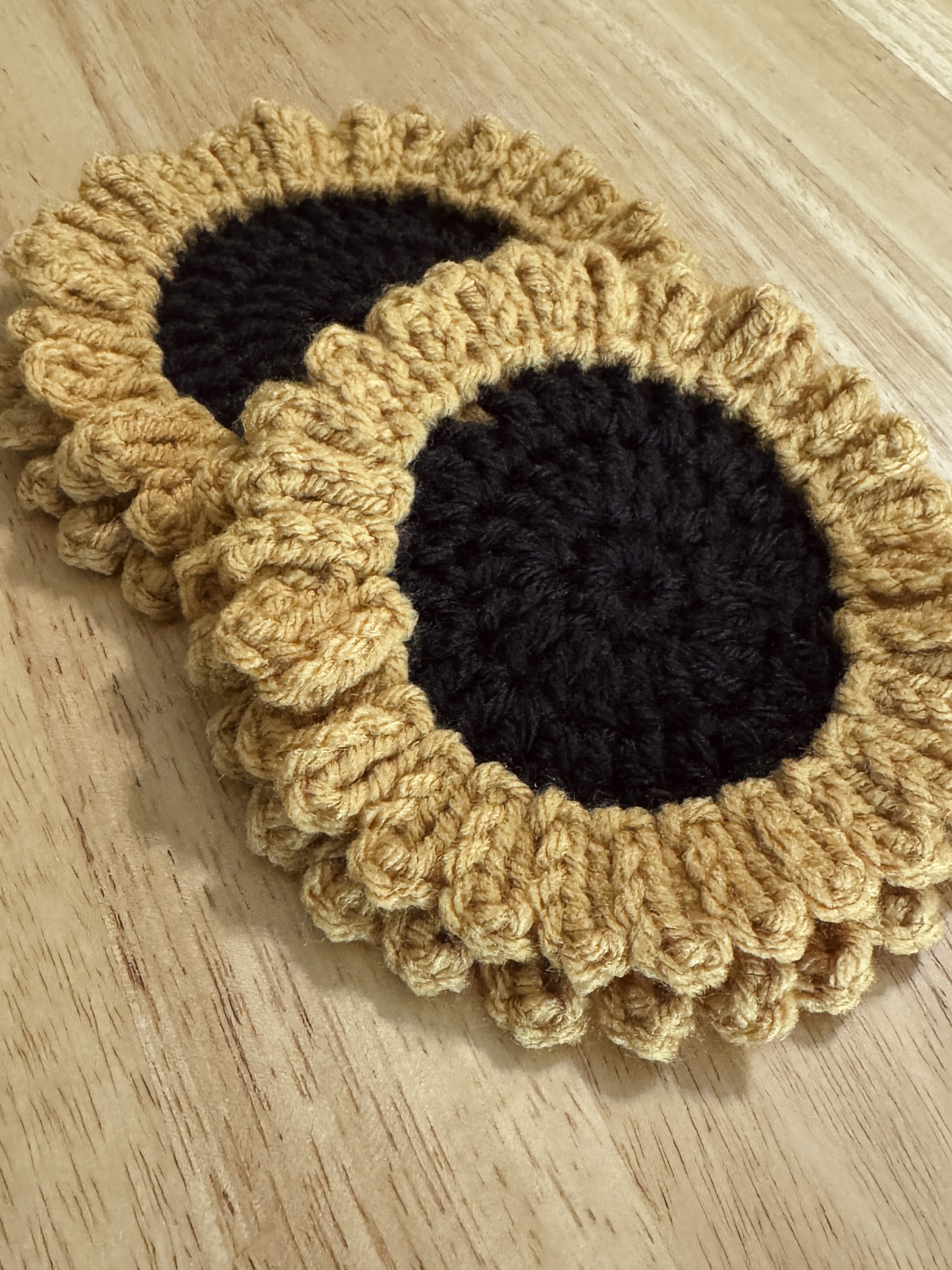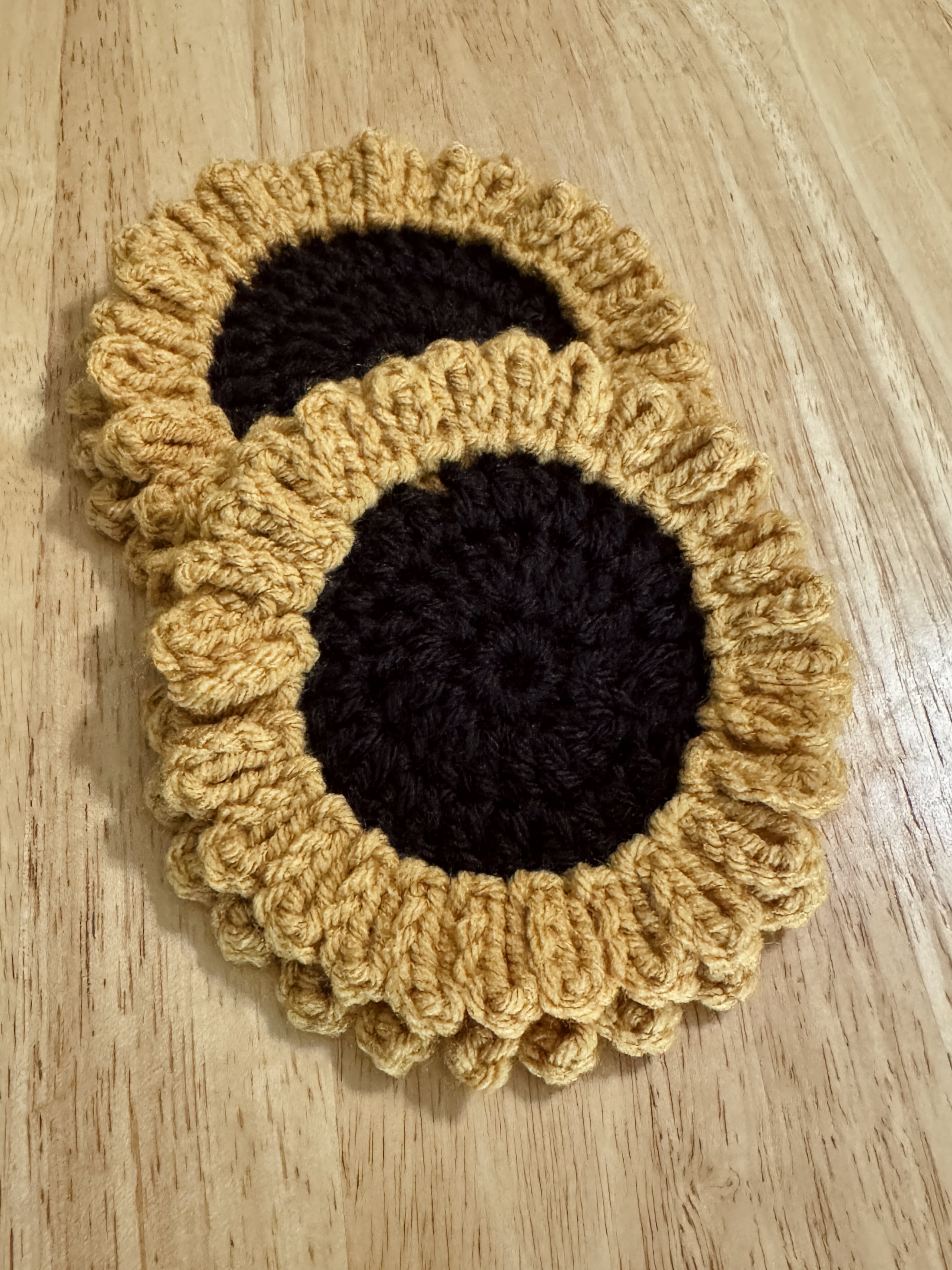 A set of two handmade crochet coasters in a fun sunflower pattern. The middle lays flat, with the flower petals in a unique double layer that encircles your cup or mug.