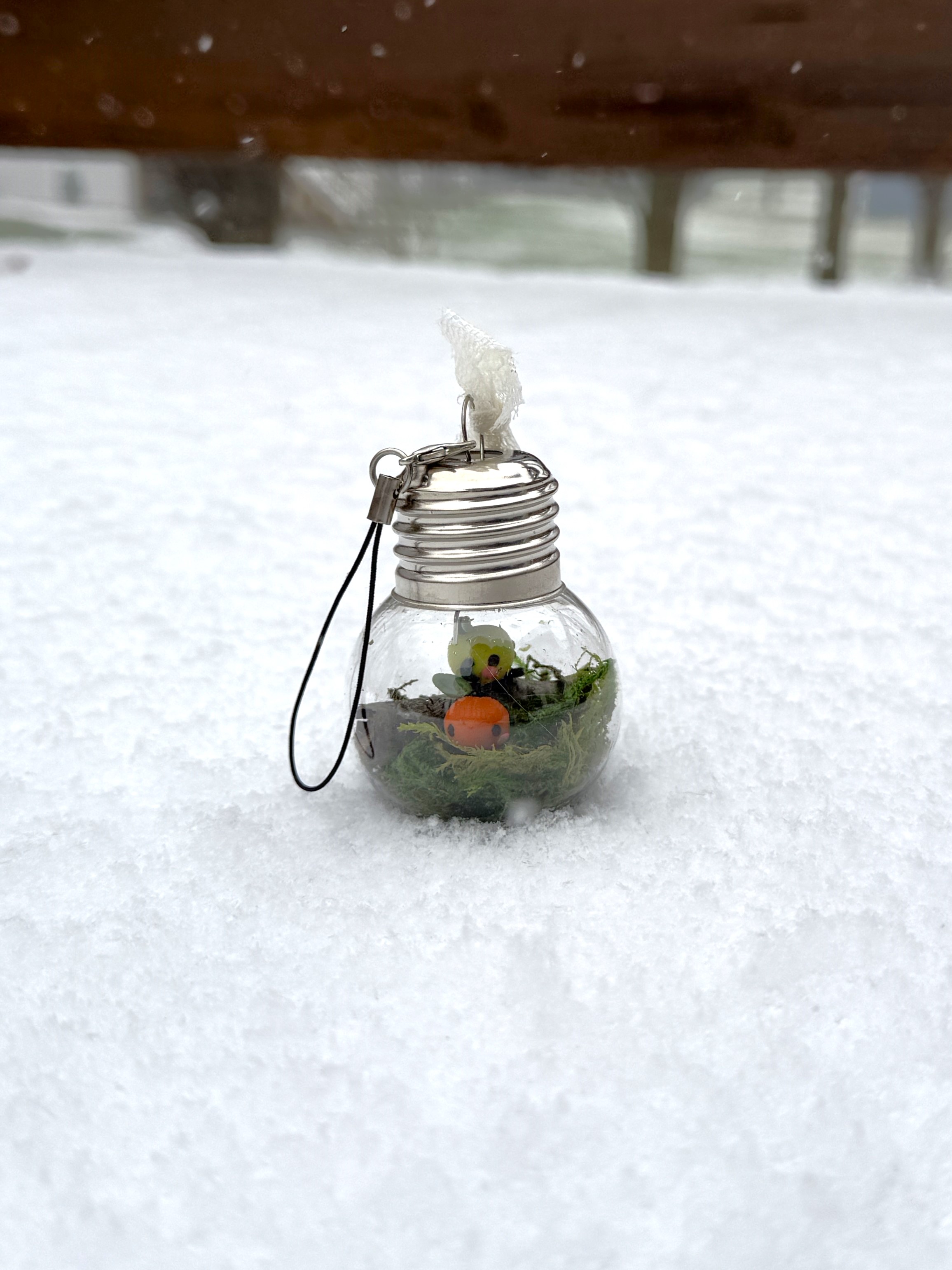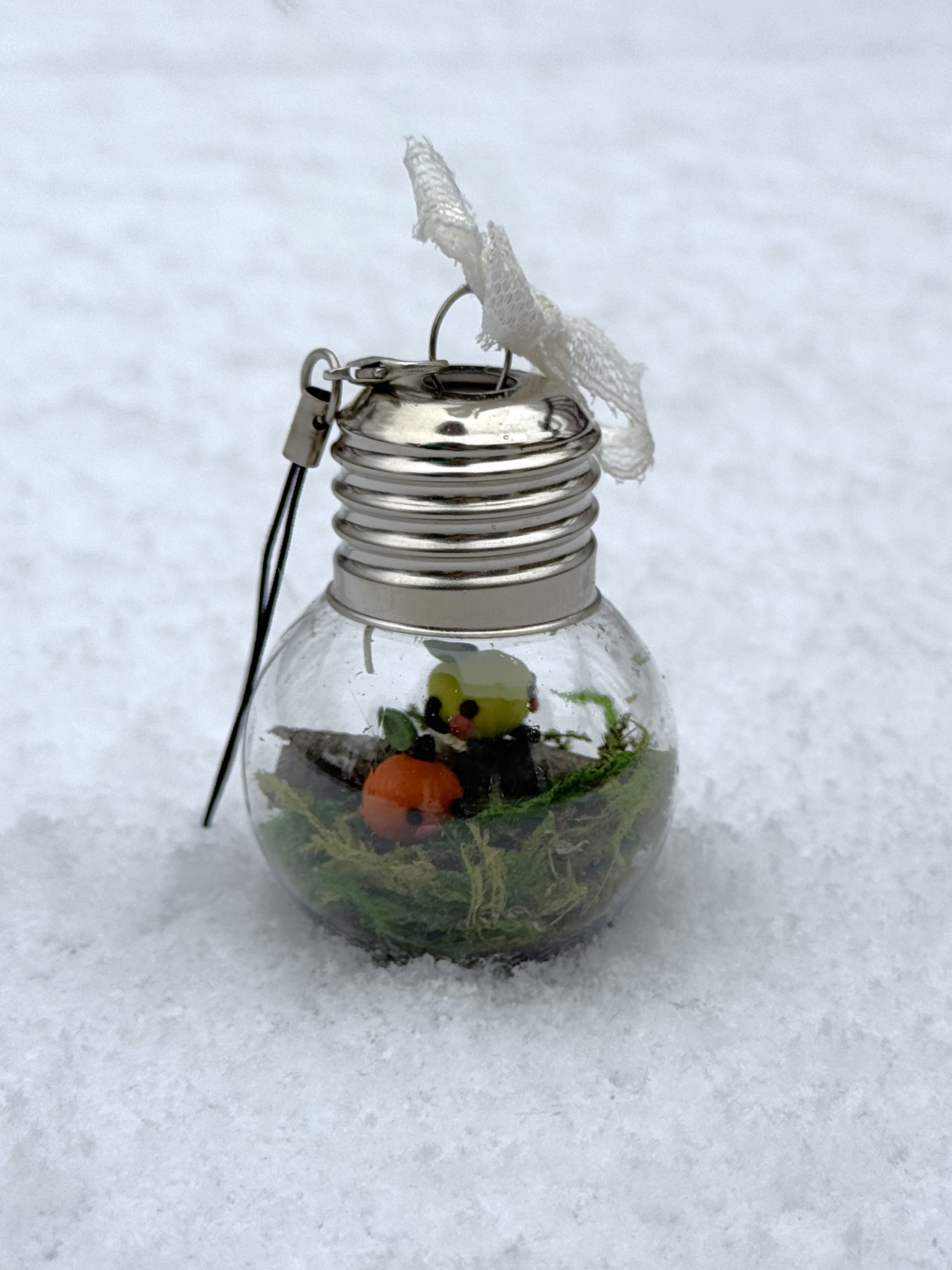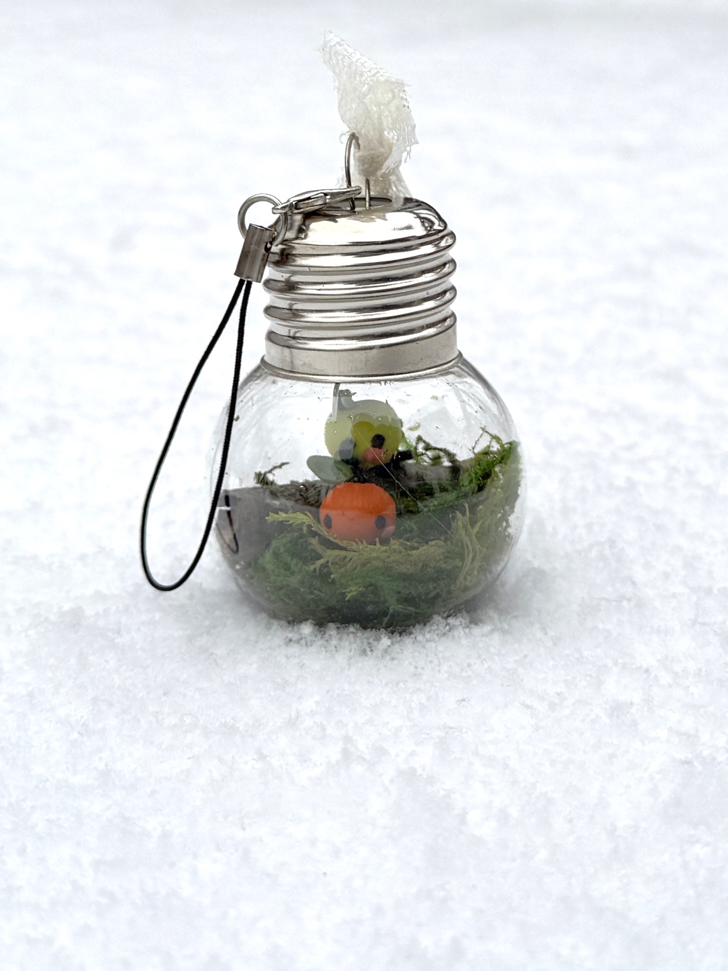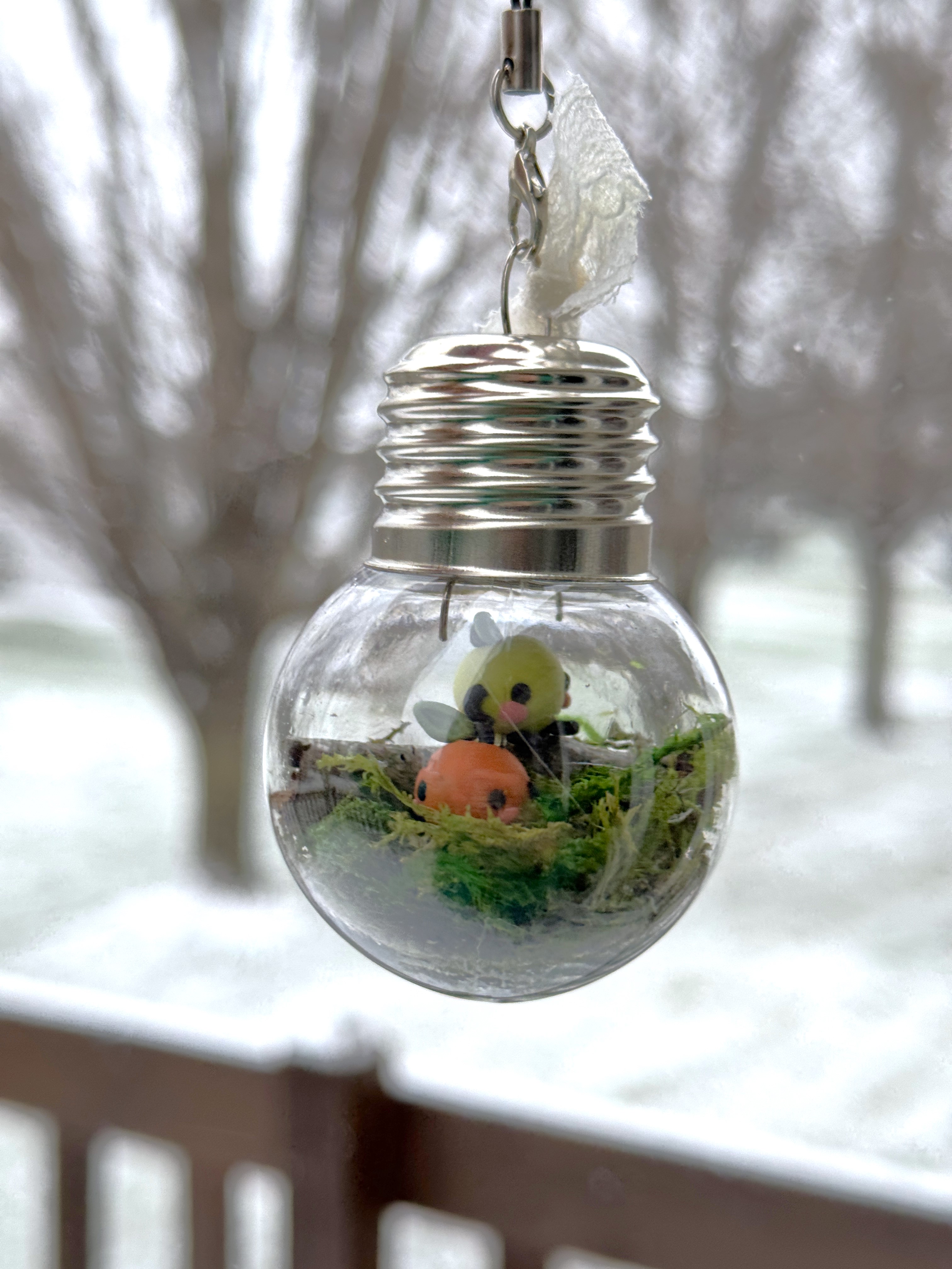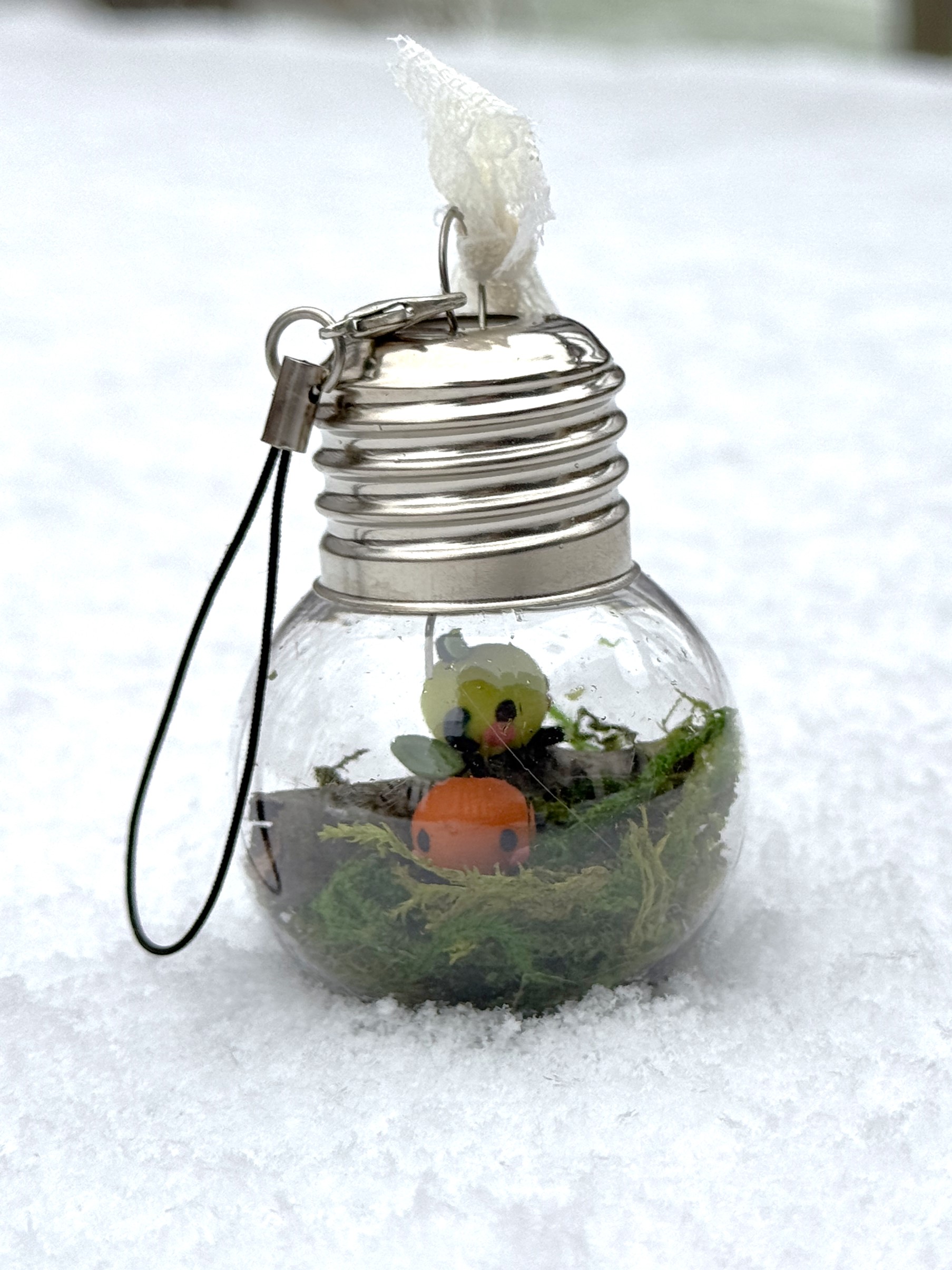 It includes a lobster clasp keychain for easy hanging, and the plastic bulb will help keep them safe from curious cats [or other pets/children/roommates] that may be interested in swatting at the small forest sprites.