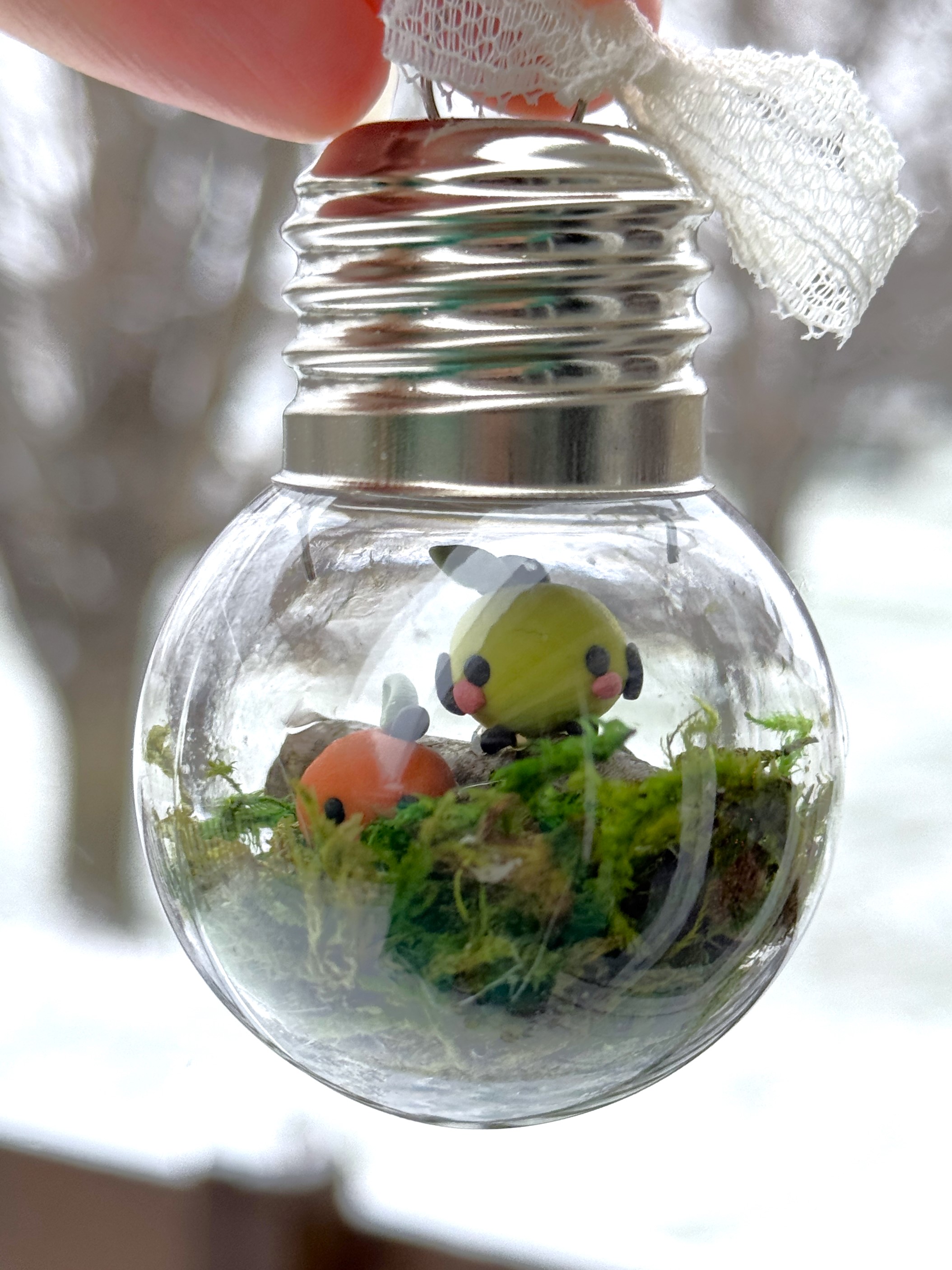 Each lightbulb shaped ornament has two small Junimos handcrafted from polymer clay. They sit in a mossy globe with a small twig, and the metal hanger is tied with a small lace ribbon.